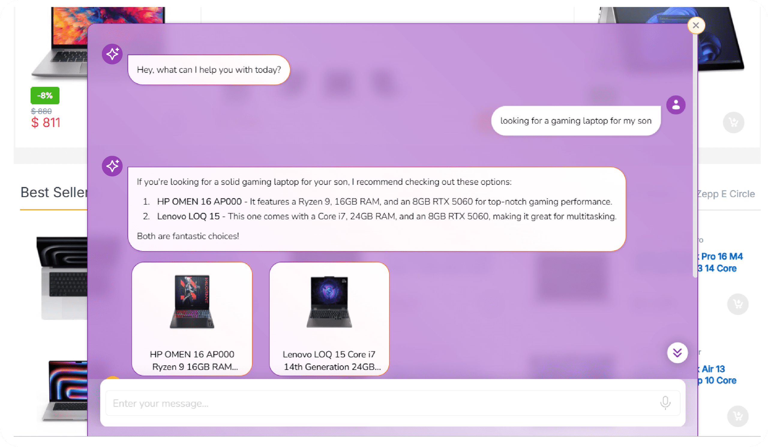 VendifAI appears on your website as a conversational shopping assistant. Customers interact with it via chat (and optionally voice), ask questions, explore products, compare options, and add items to their cart, all without leaving the conversation.
