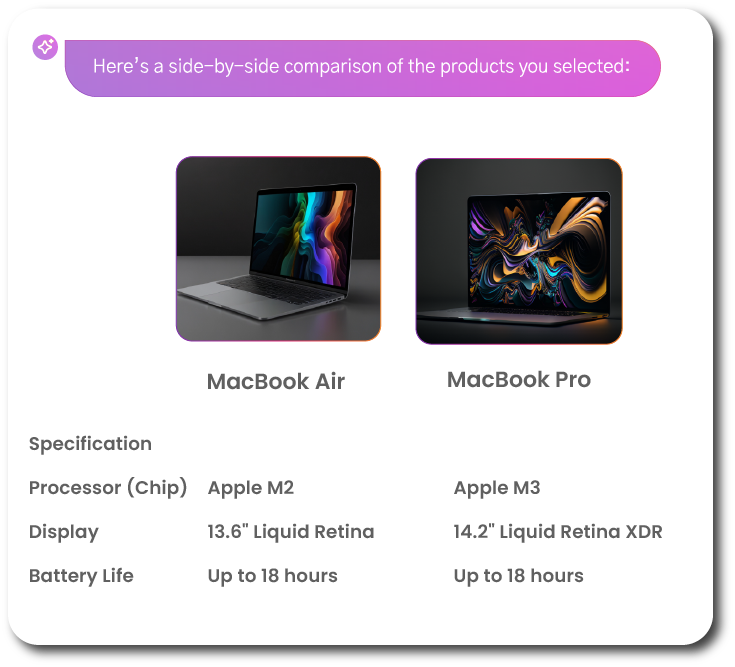 Shoppers select items to compare, and VendifAI shows details such as price and features, side-by-side, so the customers can make faster and more confident purchase decisions.